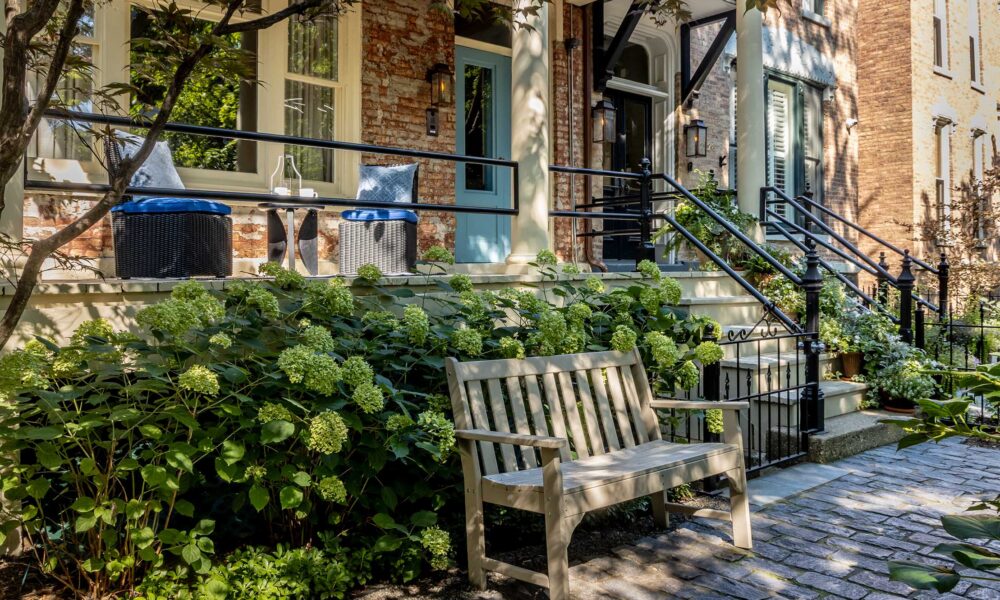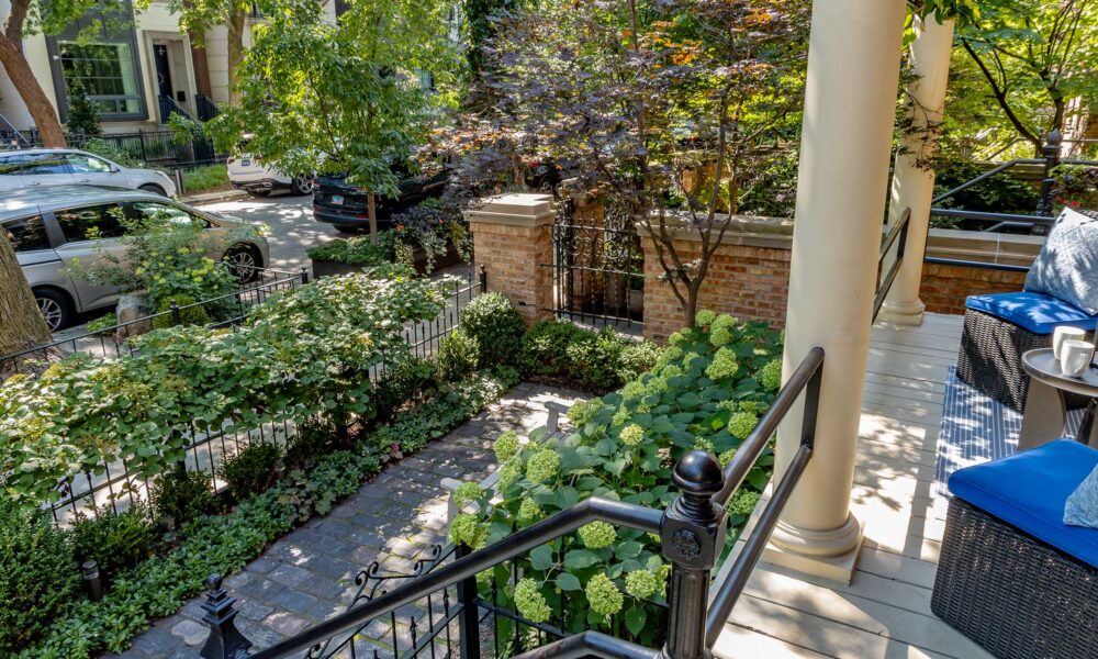Our design intent was to use a soft, green plant palette to avoid excess color and “noise” which could detract from the beautiful architecture, brick and ornamental ironwork featured in the front garden. A mix of hydrangea, groundcover and low grass serve as neutral elements, allowing the house to shine. And in the evening, as the sun sets in the West, the flickering light from classical gas lanterns flanking the front door casts a warm glow over the garden.